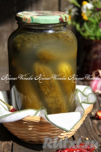 Залить огурцы в банке горячим рассолом, закрутить (или закатать) предварительно прокипячённой крышкой и перевернуть кверху дном. Укутать баночку с огурцами в одеяло и оставить до полного остывания, а затем убрать в кладовку (или погреб).